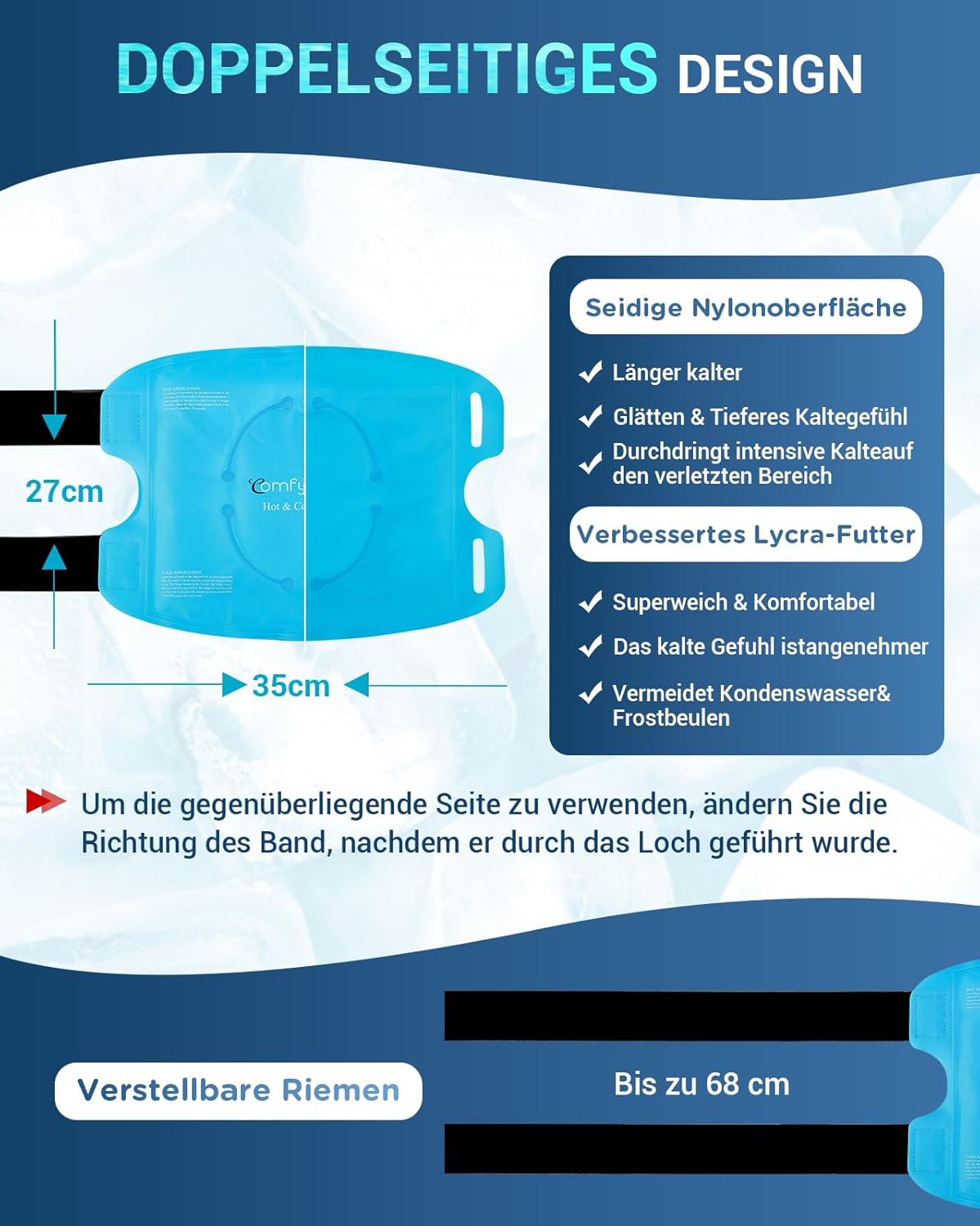 Unsere Kühlkompressen verwendet ein professionelles Gel, bei -18 °C nicht gefriert und nach 1-2 Stunden flexibel bleibt. Was Ihnen eine wirksame Linderung für akute und chronische Schmerzen, Muskelschmerzen, Arthritis, Entzündungen, Schwellungen und Hilfe bei Verletzungen Erholung bietet.