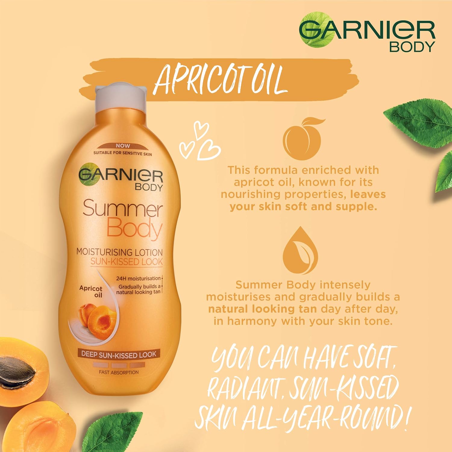 Holen Sie sich einen tiefen, sonnenverwöhnten Look mit dieser feuchtigkeitsspendenden Lotion, die mit Aprikosenextrakt angereichert ist.