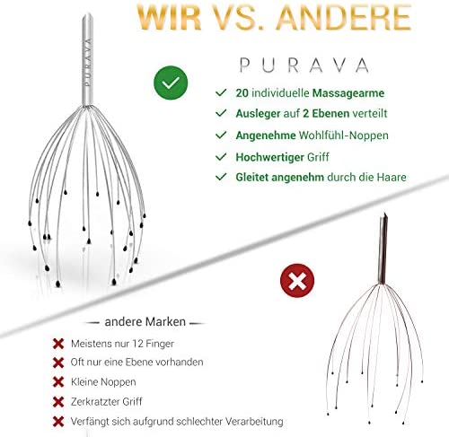 PURAVA steht für Innovation im Wellness Bereich. Deshalb haben wir die 20 Finger Kopfmassage ins Leben gerufen. Im Gegensatz zu herkömmlichen Massagegeräten mit 12 Fingern, erleben Sie durch unser Kopfmassagegerät ein deutlich intensiveres und grossflächigeres Gefühl. Die Ausleger auf zwei Ebenen sorgen ebenfalls für eine einzigartige Kopfmassage!