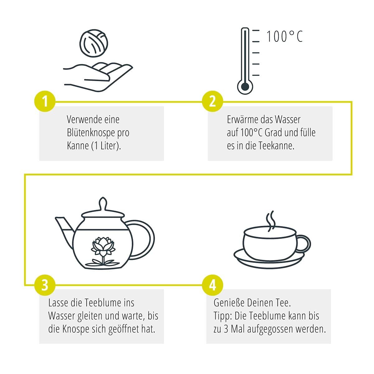 Wasser aufkochen (100°C) und in eine Glas-Teekanne füllen. Die geschlossene Teeblume langsam in die Kanne gleiten lassen.